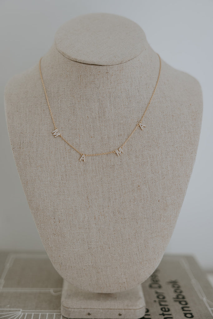 Celebrate the most important woman in your life with this delicate, sparkly MAMA necklace in radiant gold. Designed with subtle spacing between each letter, the word "MAMA" glimmers beautifully, catching the light with every movement. Its minimalist elegance and dainty chain make it perfect for layering or wearing solo as a heartfelt statement.