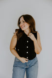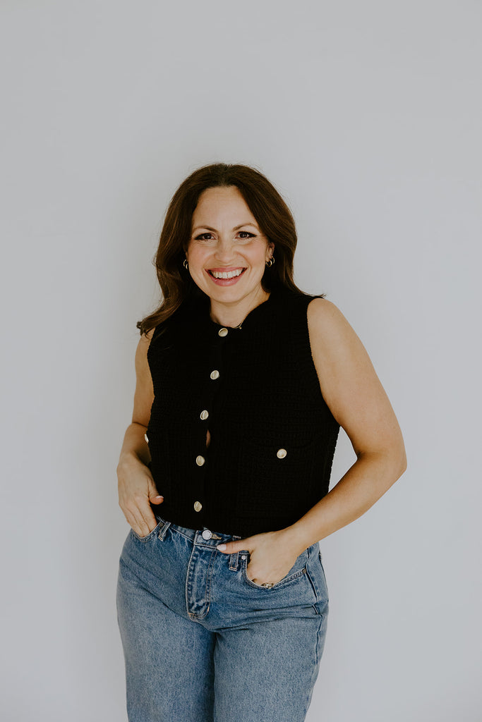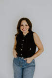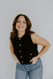 This knit vest is a timeless layering piece with a touch of polish. Designed with a soft, structured knit and finished with elegant gold button details, it offers a flattering fit that feels both classic and modern. Wear it on its own or layered over a tee or blouse for an effortlessly styled look that works year-round.