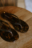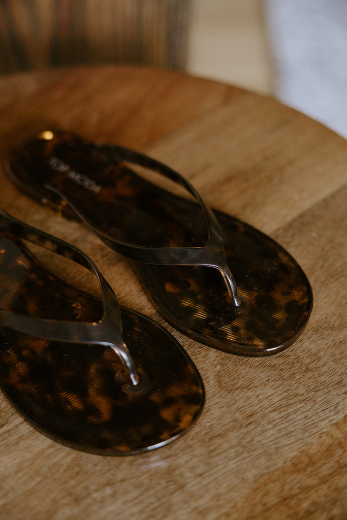 Lightweight jelly sandals featuring a glossy tortoise print for an elevated twist on a warm-weather staple. Flexible, easy to wear, and perfect for pool days or casual summer outfits.