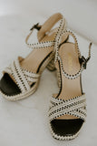 Elevate your look with these timeless woven block heel sandals, designed to balance elegance and comfort. Featuring intricately woven straps in a chic black-and-natural contrast, this sandal adds texture and sophistication to any outfit. The open-toe design is complemented by a secure ankle strap with an adjustable buckle for a custom fit, while the sturdy block heel offers all-day stability and ease. Perfect for dressing up denim or completing an evening ensemble, this versatile pair transitions effortlessly from day to night.