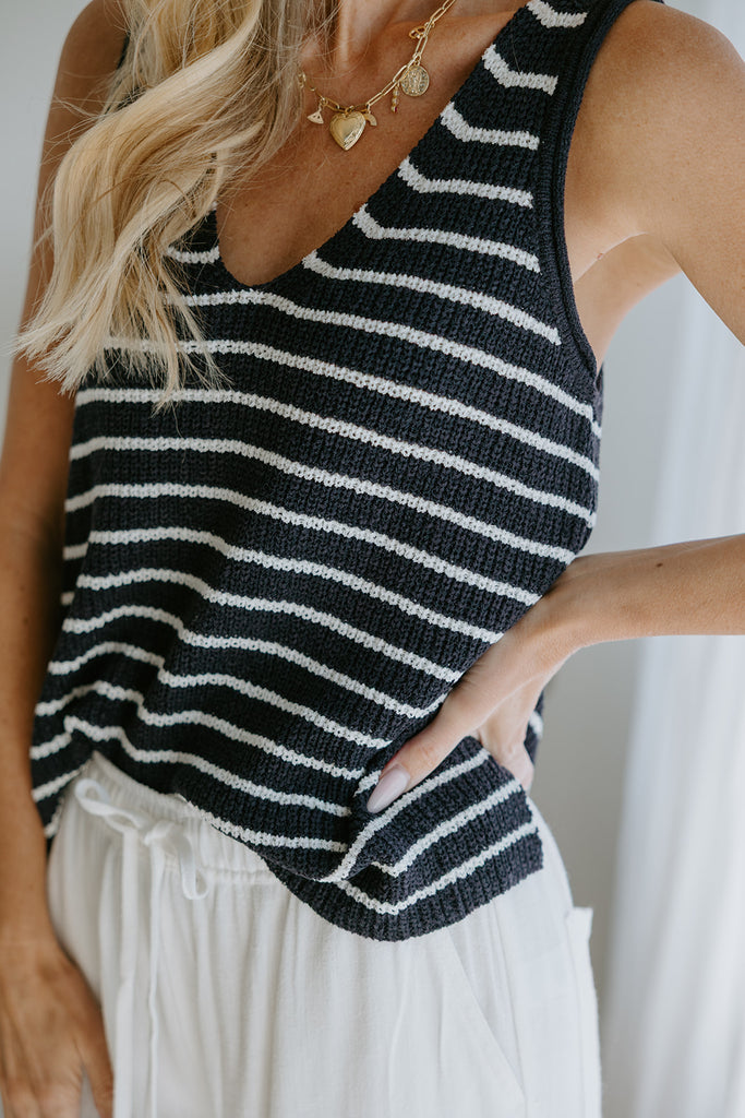 Classic meets comfort in this navy striped knit tank top! With its timeless nautical stripes and soft, textured knit, this top is equal parts comfy and chic. The relaxed fit and sleeveless cut make it perfect for sunny strolls, weekend brunches, or layering on breezy days. Dress it up with a flowy skirt or keep it casual with your favorite denim—either way, it’s a wardrobe win!