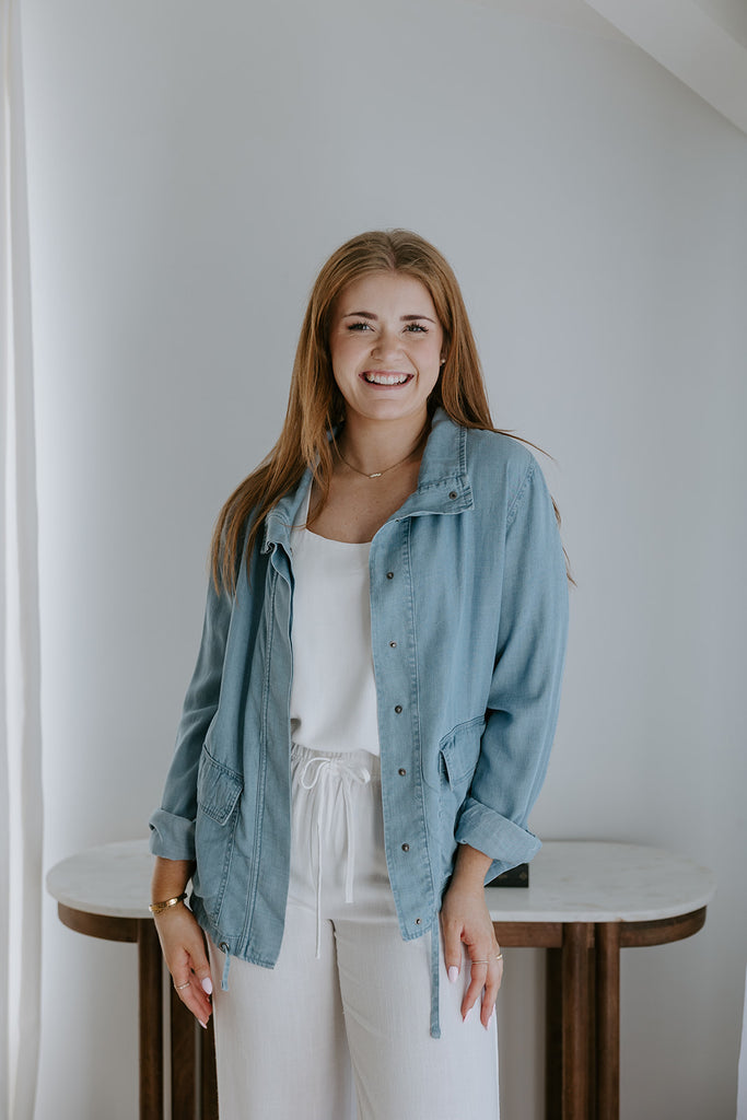 Effortlessly cool and endlessly versatile, our Tencel Lightweight Button-Up Jacket in a soft blue hue is your go-to layer for transitional weather and laid-back days. Crafted from breathable, eco-friendly Tencel fabric, this jacket offers a silky-smooth feel with a gentle drape that flatters every silhouette.