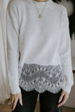 This sweater features a delicate lace hem that adds an elevated touch to a classic knit silhouette. The contrast of textures creates a subtle, romantic finish - perfect for dressing up your everyday look. Pair it with denim for a casual-chic vibe or with a skirt for something a little more refined. A timeless piece with just the right amount of detail.