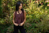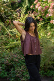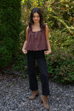 Effortlessly sweet, this brown tank top features delicate eyelet detailing and a soft lace trim for a touch of vintage charm. The lightweight fabric and scalloped edges make it perfect for warm days or easy layering. Pair it with denim or a maxi skirt for an effortlessly cute look.