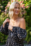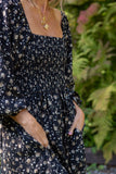 Step into the season with the Fall Floral Smocked Midi Dress—a timeless piece that blends comfort with charm. Featuring a black base adorned with cream and brown florals, this dress captures the warm, earthy tones of fall. The smocked bodice offers a flattering, flexible fit, while the sleeves provide just the right amount of coverage. Functional side pockets add everyday ease to this effortlessly stylish look. Whether you're dressing it up with boots or keeping it casual with flats, this midi dress is a must-have for your autumn wardrobe.