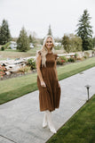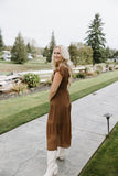 Effortlessly chic and endlessly versatile, this brown midi dress features delicate smocking at the bodice for a flattering, comfortable fit. Crafted from soft, breathable fabric, it drapes gracefully to a midi length, striking the perfect balance between casual and refined. The smocked detailing enhances the silhouette while allowing stretch and ease of movement, making it ideal for day-to-night wear. Finished with subtle feminine touches, this dress pairs beautifully with sandals for a relaxed daytime look or boots and a jacket for cooler evenings.
