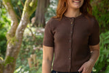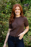 A modern take on a timeless staple, this Short Sleeve Knit Button-Up Sweater is equal parts cozy and refined. Crafted in a soft cream knit, it features a relaxed silhouette with short sleeves for easy layering or standalone wear. The brown button-front detail adds a warm, classic touch—perfect for dressing up or down. Pair it with your favorite denim or tuck it into a skirt for an effortlessly polished look.