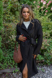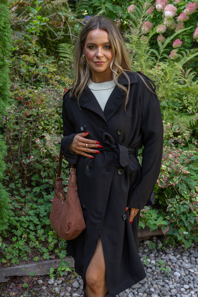 A forever classic! This black trench coat brings effortless sophistication to any outfit. Designed with clean lines, a tailored silhouette, and classic details like a belted waist and storm flap, it’s the ultimate layering piece for polished, everyday style. Throw it over anything for instant cool - rain or shine.