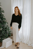Sleek and sophisticated, this black satin maxi skirt features a smooth, glossy finish and a fluid drape that moves beautifully. Designed with a flattering high waist and timeless silhouette, it’s perfect for dressing up with heels or pairing with a simple top for an elevated everyday look.