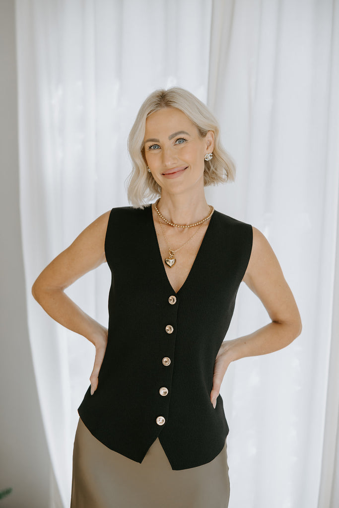 Elevate your layering game with this timeless knit vest, designed for effortless sophistication and comfort. Crafted from a soft, medium-weight knit, this vest offers a flattering silhouette that adds a refined touch of elegance, giving a modern twist to a classic staple. Whether styled for the office, weekend brunch, or a chic evening out, this versatile piece brings warmth, texture, and polish to any outfit.