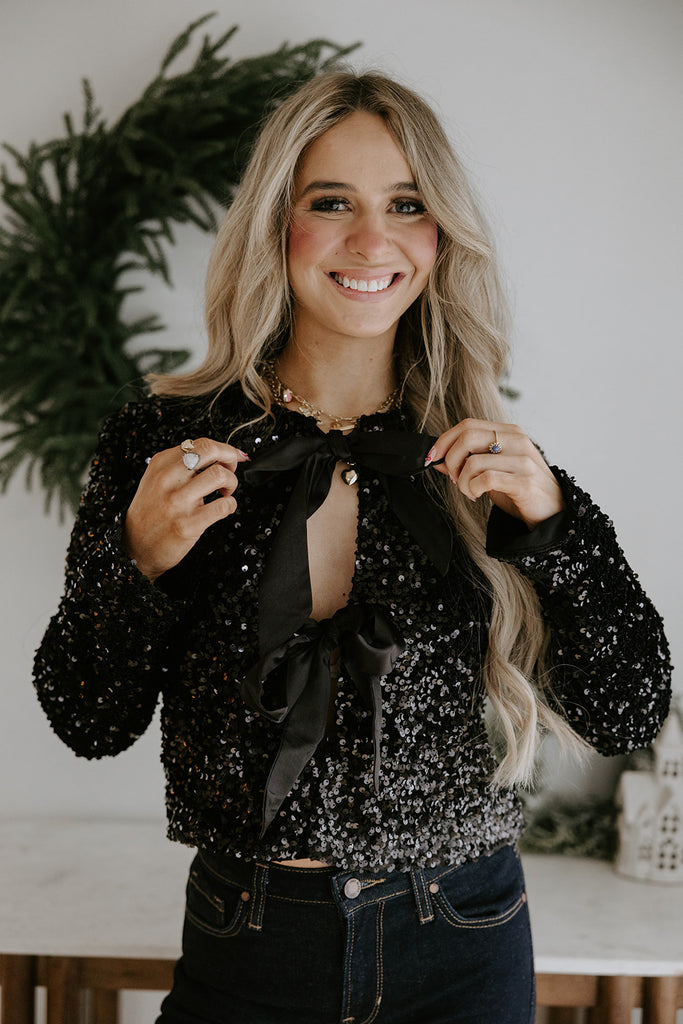 A show-stopping layer made for festive nights. This sequin bow tie front shirt/jacket combines shimmer with a touch of sweetness, featuring an allover sequin finish and a statement tie-front detail. Wear it open as a light jacket or tied as a standout top - the versatile silhouette lets you choose your vibe. Perfect for holiday parties, girls’ nights, or anytime you want a little extra sparkle.