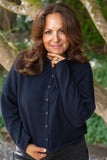 Timeless and endlessly versatile, this navy button-down cardigan is a wardrobe essential for effortless layering. Made from a soft, breathable knit, it features a classic crew neckline, rolled trim, and a boxy fit that flatters without feeling too snug. The deep navy hue adds a touch of sophistication, making it easy to dress up or down.