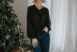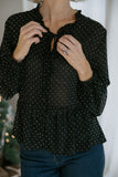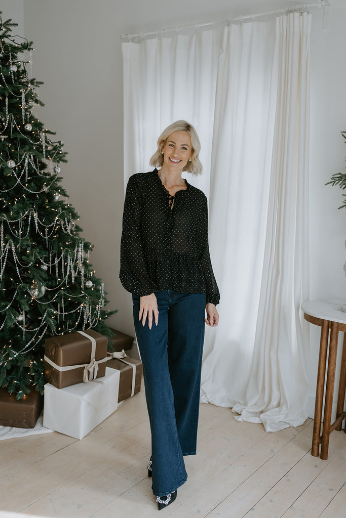 Sweet with a touch of shimmer. This babydoll top features a flirty, flowy silhouette dusted with sparkle, giving it an effortlessly glam feel. The flounce waist creates a soft, flattering shape, while the light-catching finish adds party-ready shine. Perfect for pairing with denim, faux leather, or anything that needs a little extra magic.