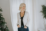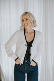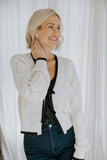 This sweater features contrast black trim that frames the silhouette beautifully, finished with a chic front bow for a touch of vintage-inspired charm. The knit is cozy yet refined, making it an easy piece to dress up or down. Pair it with denim, trousers, or skirts for a look that’s effortlessly put-together.