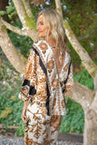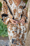 Elevate your everyday elegance with this effortlessly chic two-piece set, featuring a dolman sleeve tie-front shirt and satin wide-leg patterned pants. Crafted from luxuriously soft satin, this ensemble boasts a rich, vintage-inspired floral print in warm earth tones of caramel, ivory, and black that create a striking visual flow from top to bottom.