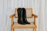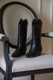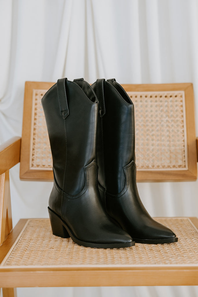 Saddle up in timeless Western style with The New Cowgirl Boot in Black — a sleek, modern take on a classic silhouette. Crafted from smooth, rich faux leather with a subtle sheen, these boots feature a gently pointed toe and a sculpted mid-height heel that deliver both comfort and confidence. The tall shaft is detailed with clean stitching and classic pull tabs for easy wear, while the structured design ensures the boots maintain their shape beautifully.