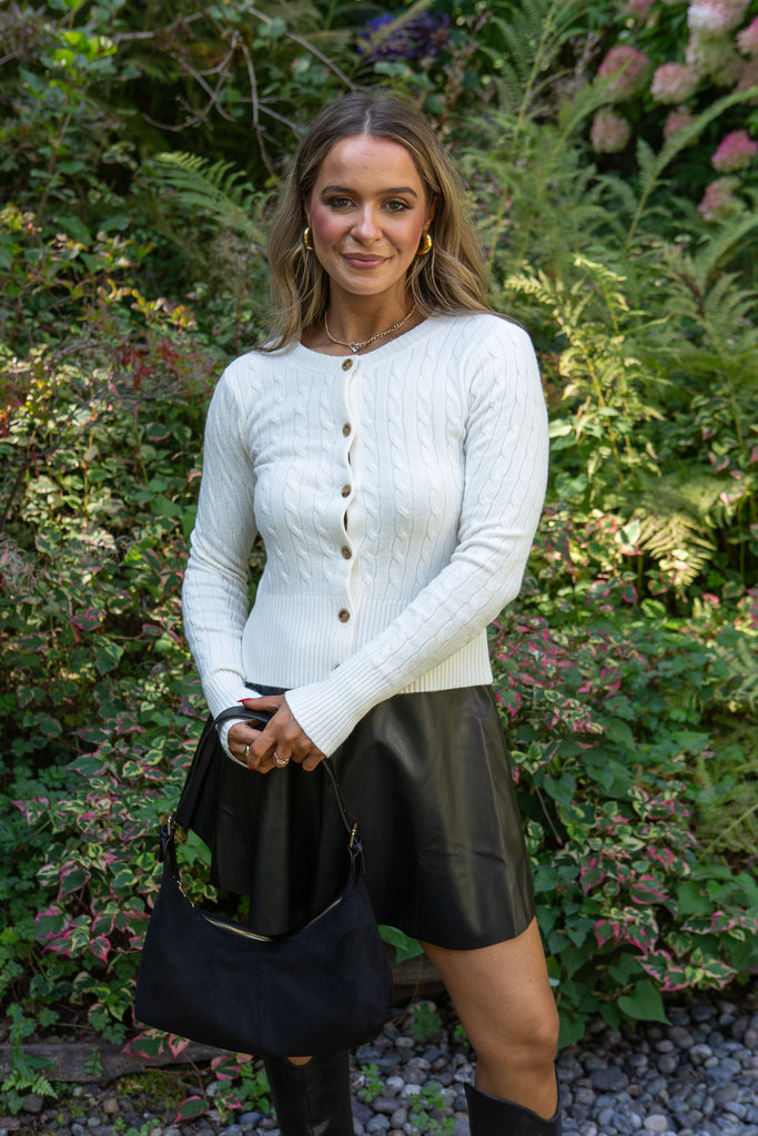 Classic with a cozy twist, this cable knit cardigan is your new layering essential. Crafted in a thinner knit with timeless cable detailing, it’s soft, stretchy, and perfect for throwing on over anything. Button it up for a snug, sweater-weather vibe or wear it open for effortless layering.