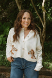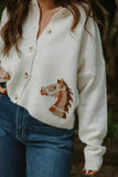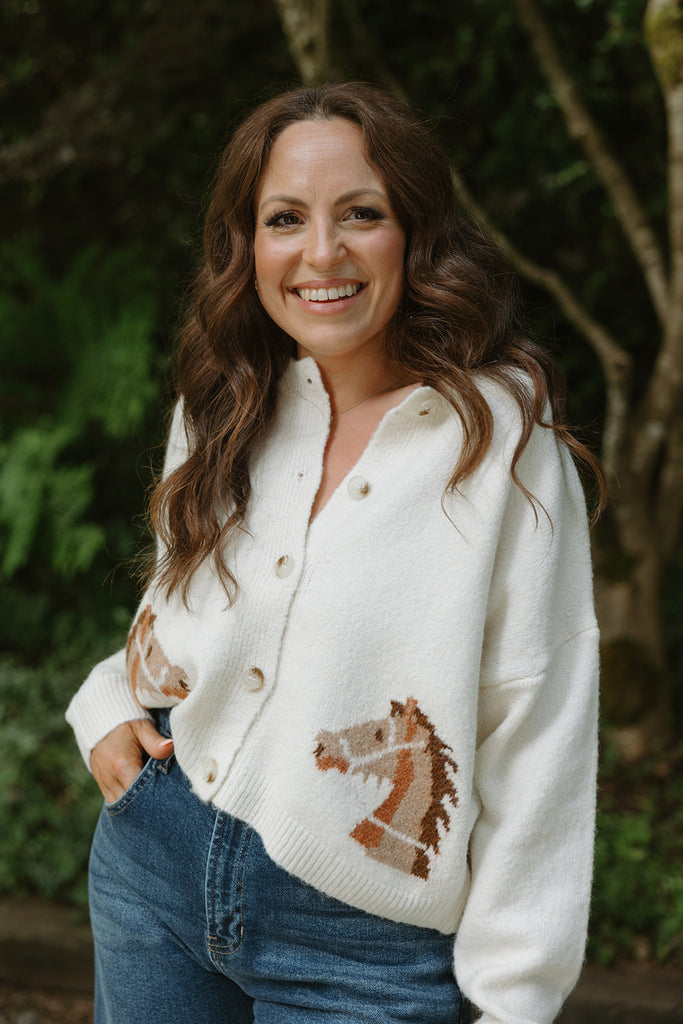 Giddy up in cozy style! This charming sweater features a whimsical graphic that brings a touch of countryside magic to your everyday look. Knit from ultra-soft yarn with a relaxed, slightly oversized fit, it’s perfect for layering over your favorite jeans. Ribbed cuffs and hem keep things cute, while the sweet equestrian vibe adds a playful twist. Whether you’re out for a crisp morning walk or curled up fireside, this sweater is pure perfection.