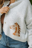 Giddy up in cozy style! This charming sweater features a whimsical graphic that brings a touch of countryside magic to your everyday look. Knit from ultra-soft yarn with a relaxed, slightly oversized fit, it’s perfect for layering over your favorite jeans. Ribbed cuffs and hem keep things cute, while the sweet equestrian vibe adds a playful twist. Whether you’re out for a crisp morning walk or curled up fireside, this sweater is pure perfection.