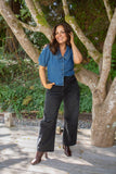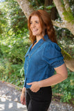 Effortlessly blending classic denim with modern details, this V-neck puff sleeve denim shirt is a fresh take on your everyday essential. Crafted from soft, durable denim, it features a flattering V-neckline and statement puff sleeves that add volume and a touch of femininity. The relaxed fit makes it perfect for tucking it into jeans or pairing it with a skirt.