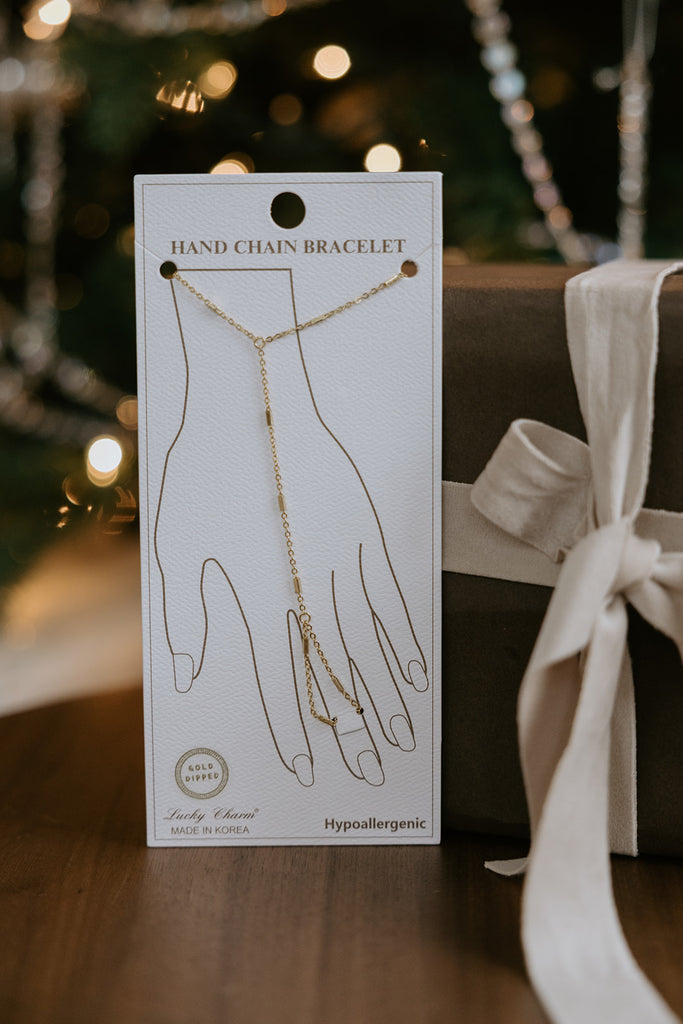 This gold-dipped hand chain bracelet is a modern statement that elevates any look. Designed with a fine chain that drapes effortlessly from wrist to finger, it adds subtle shine while still feeling lightweight and wearable. Hypoallergenic and comfortable for all-day wear, it makes a unique and stylish holiday stocking stuffer.