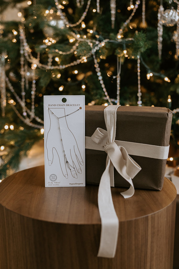 This white-dipped hand chain bracelet is a modern statement that elevates any look. Designed with a fine chain that drapes effortlessly from wrist to finger, it adds subtle shine while still feeling lightweight and wearable. Hypoallergenic and comfortable for all-day wear, it makes a unique and stylish holiday stocking stuffer.