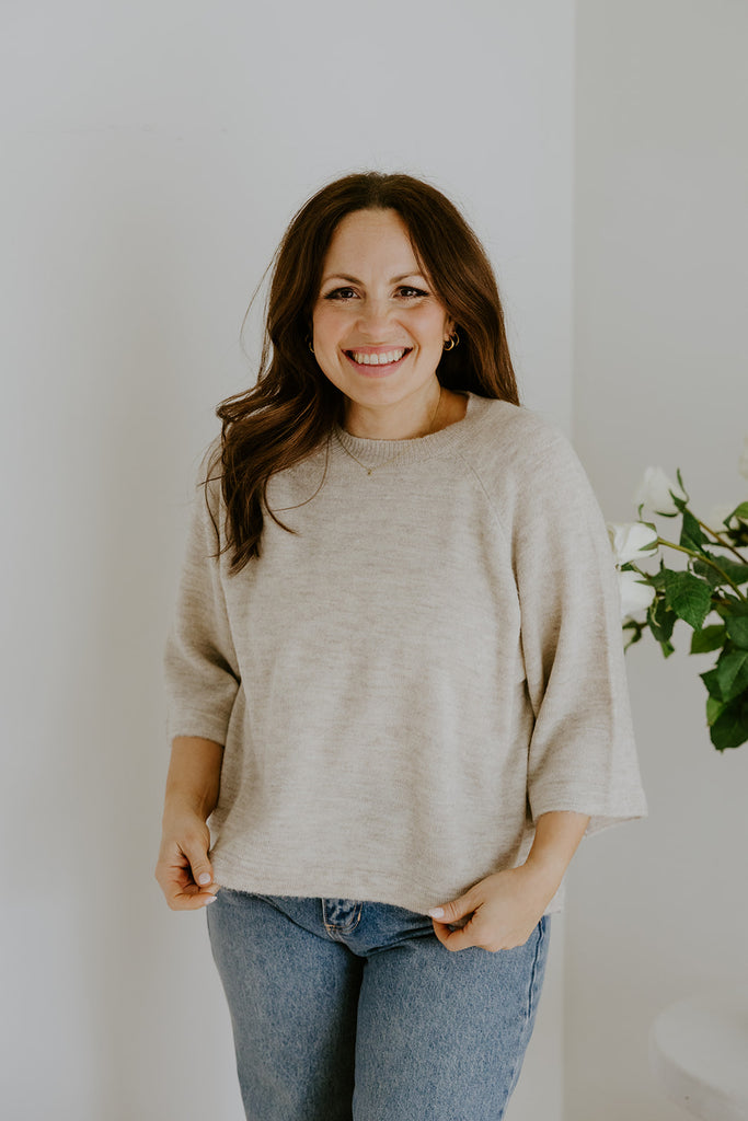 This 3/4 sleeve sweater is the perfect blend of comfort and effortless style. The neutral tone makes it easy to pair with anything, while the soft knit and flattering sleeve length create a polished, cozy look.
