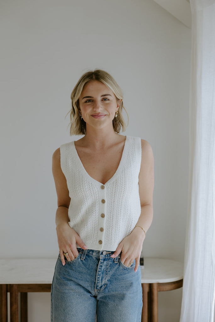 A dreamy crochet knit vest with delicate stitching and a soft, cozy feel. Designed for layering, it adds the perfect touch of warmth and sweetness to any outfit. Pair it with flowy skirts or your favorite jeans for an effortlessly cute look.
