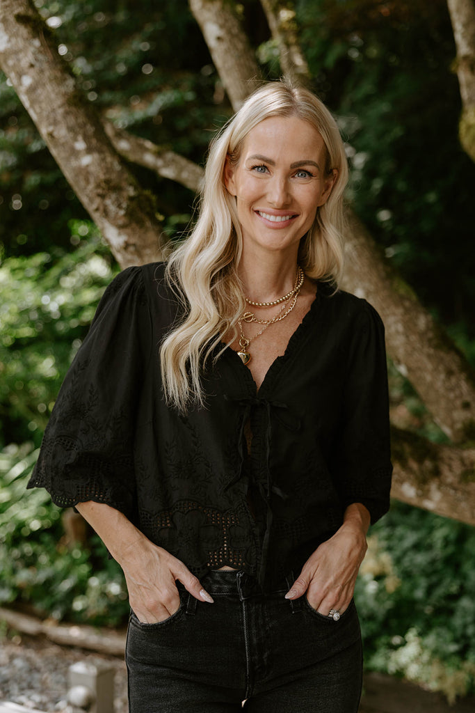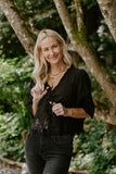 Eyelet & Floral Embroidery Tie Front Shirt - Black