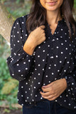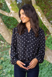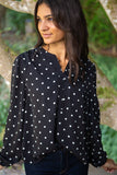 Playful yet polished, this polka dot blouse adds a timeless charm to any outfit. Designed with a soft drape and a relaxed silhouette, it features a classic neckline, button-down front, and subtle gathers at the cuffs for a touch of femininity. Pair it with denim for a casual look or tuck it into tailored trousers for a refined finish.