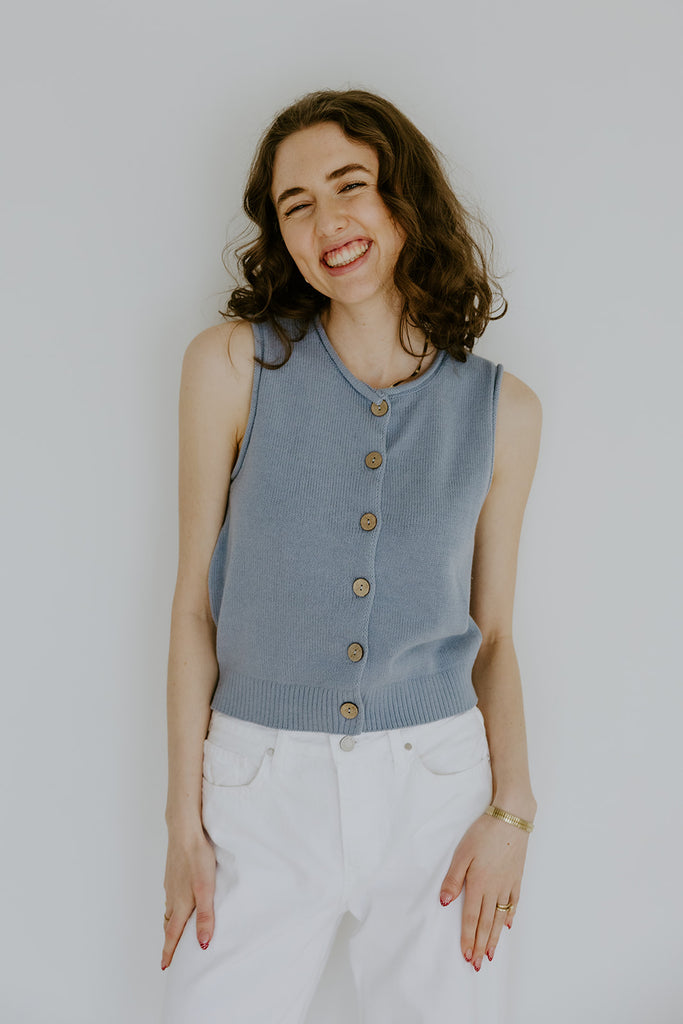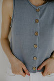 A soft knit vest inspired by breezy seaside days. Featuring faux wood buttons and a lightweight feel, it’s perfect for layering over blouses or dresses. Think coastal mornings, salty air, and effortless charm.