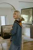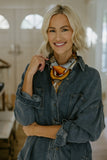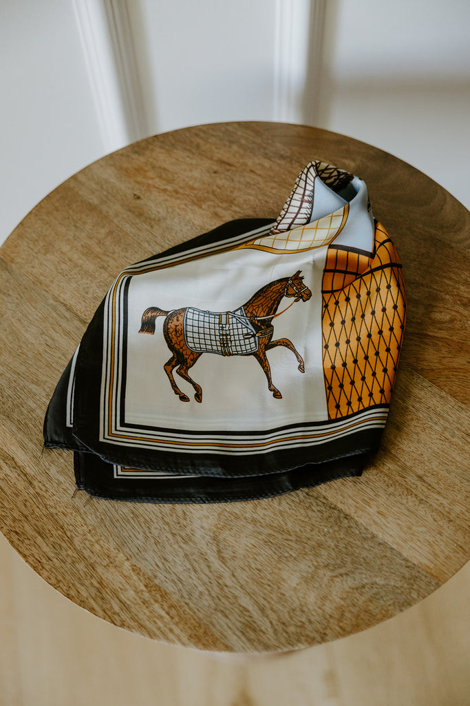 Crafted from smooth, lightweight silk, it drapes beautifully around the neck for an effortlessly elegant look. The horse print brings personality, while the blue and orange palette makes it versatile enough to pair with both neutral tones and brighter statement pieces.