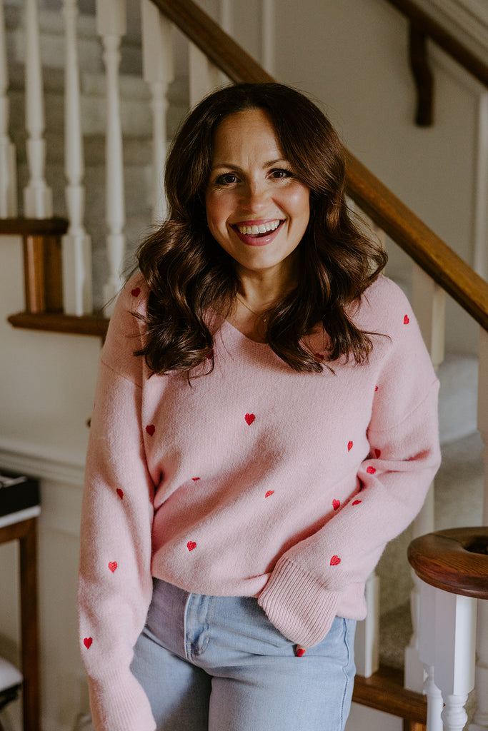 Sweet with a subtle statement, this pink sweater with red heart accents adds a playful touch to your everyday style. Designed with a soft knit feel and a flattering slight V-neckline, it offers an easy, relaxed fit that’s both comfortable and chic. The heart pattern brings just the right amount of charm, making it perfect for dressing up denim or layering over a skirt. Cozy yet eye-catching, this sweater is a go-to for adding personality to your look.