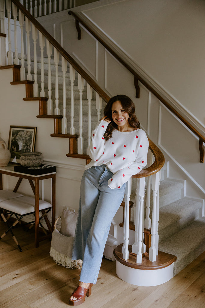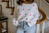 A cozy white sweater sprinkled with cheerful hearts for a fun, flirty vibe. Soft and comfy, it’s perfect for casual days, Valentine’s looks, or just spreading a little love wherever you go.