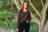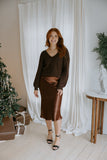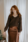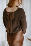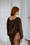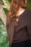 A classic with a charming twist, this V-neck sweater features a soft knit body and an elegant bow detail at the back for a hint of romance. The relaxed fit and gentle drape make it perfect for layering, while the open back adds a touch of unexpected femininity. Effortlessly polished for day-to-night styling.