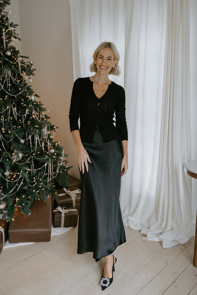 Sleek and sophisticated, this black satin maxi skirt features a smooth, glossy finish and a fluid drape that moves beautifully. Designed with a flattering high waist and timeless silhouette, it’s perfect for dressing up with heels or pairing with a simple top for an elevated everyday look.