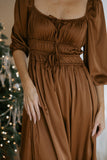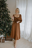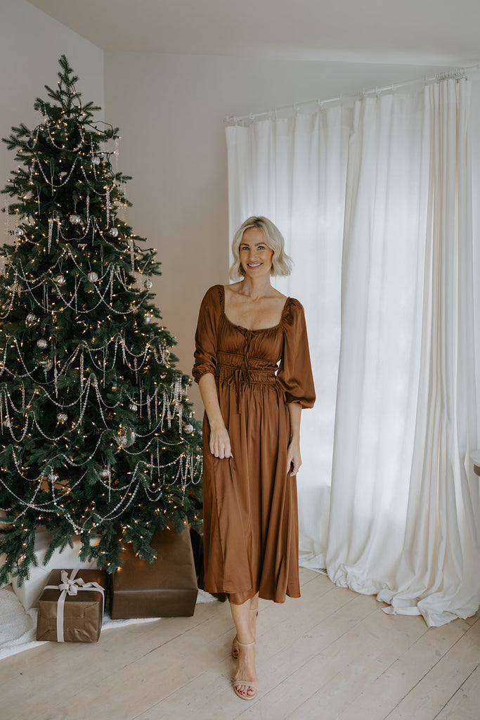 Elegant and refined, this satin midi dress features a smooth, lustrous finish and delicate bow details that add a feminine touch. The flattering midi length makes it perfect for both daytime events and evening occasions, offering a timeless look with a modern twist.